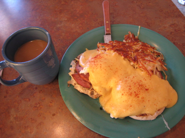 エッグベネディクトはオアフ島のニューオータニカイマナビーチホテルで食べたかったけれど、どうやらその時間は取れない予感がしているので、ここで食べておこうとオーダーする。エッグベネディクトはイングリッシュマフィンにポーチドエッグとハムがのり、ソースがかかったもので、普通は朝食にするらしい。