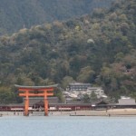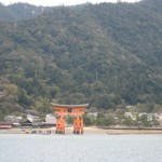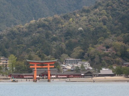 ちょうど、干潮で大鳥居まで歩いている人達が見えました。神社の後ろにある弥山がご神体