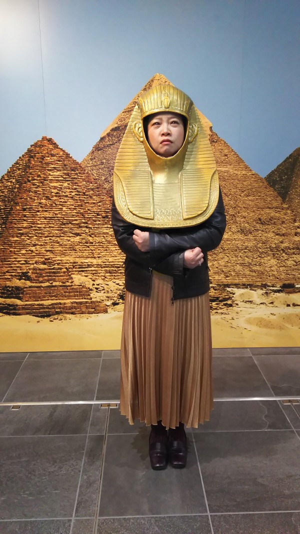 出口近くに黄金のマスクとファラオの頭巾で記念撮影できたので、やってみました